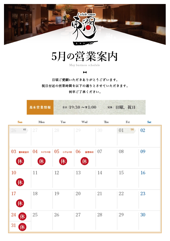 定休日が日曜・祝日のため、カレンダー通りのお休みをいただきます。
