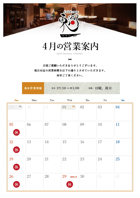 4月5月の営業カレンダーをご用意いたしました。